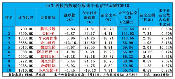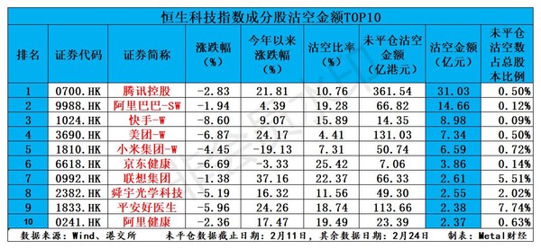 从港交所最新披露的截至于2月11日的“淡仓报告”来看,恒生科技指数32只成分股未平仓的沽空金额合计达1444.46亿港元,占港股整体未平仓沽空金额的比例为24.58%。