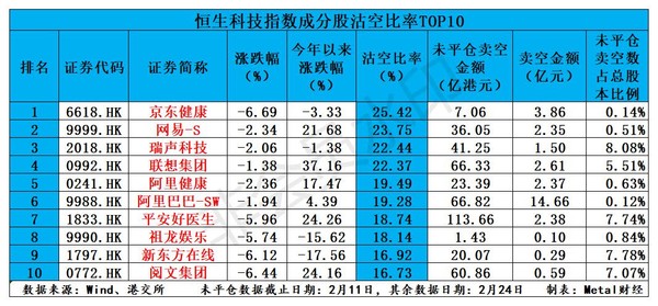 沽空比率榜TOP3分别是京东健康(6618.HK)、网易-S(9999.HK)和瑞声科技(2018.HK),沽空比率分别高达25.42%、23.75%和22.44%,2月24日的跌幅分别为6.69%、2.34%和2.06%。