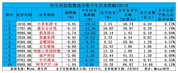 跌幅TOP3的成分股分别是小米集团-W(1810.HK)、新东方在线(1797.HK)和祖龙娱乐(9990.HK),今年以来跌幅分别为19.13%、17.56%和15.62%,2月24日的跌幅分别为4.45%、6.12%和5.74% 。