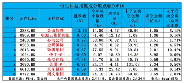 事实上,恒生科技指数成分股遭遇的集体“杀跌”早有征兆。排在沽空金额榜的第三位的平安好医生(1833.HK)未平仓沽空金额为113.66亿元,未平仓卖空数占总股本比例为7.74%;紧随其后的金山软件和微盟集团(2013.HK)的未平仓沽空金额86.90亿元和69.84亿元,未平仓卖空数占总股本比例分别为8.15%和10.42%;三家公司2月24日的股价跌幅分别为5.96%、13.16%和8.67%,均远高于均值。