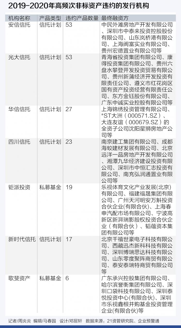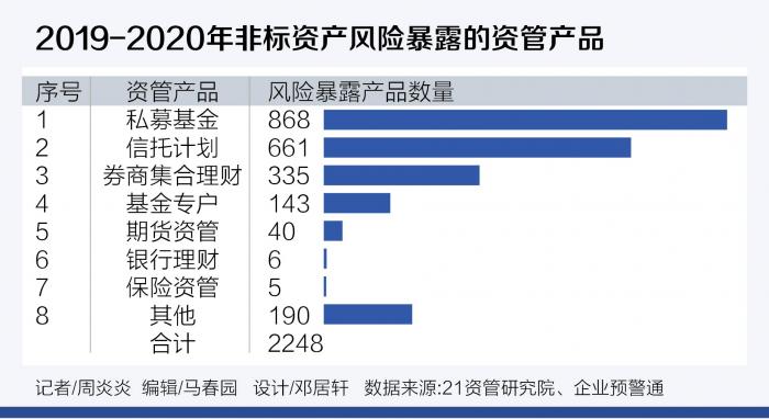 近期,21世纪资管研究院整理了2019-2020年两年间发生过违约记录的非标债项,不完全统计共计2248条,其中涉及信托计划、券商集合理财、私募基金、期货资管、银行理财、保险资管等资管产品,以及数百家机构。