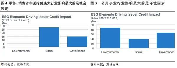 2019年1月,惠誉发布了1,534家发行人的详细ESG评级相关性评分结果,并按行业、市场(发达市场和新兴市场)、区域(美国、亚洲、欧洲)进行了详细的分析。在1,534家公司中,有22%的公司(345家)受到了E、S或G因素的影响(一个或多个得分为“4”或“5”),有将近3%的公司有一个E、S或G子因素本身导致评级发生变化(得分为“5”)。