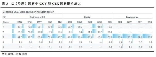 从结果来看,绝大多数的公司ESG因素评级相关性评分为3分及以下,说明多数公司的信用评级不会受到ESG风险因素的影响。相比环境和社会因素,治理因素对信用评级的影响更大,尤其是GGV因素(董事会独立性和有效性、所有权集中)和GEX因素(管理策略及其执行)。