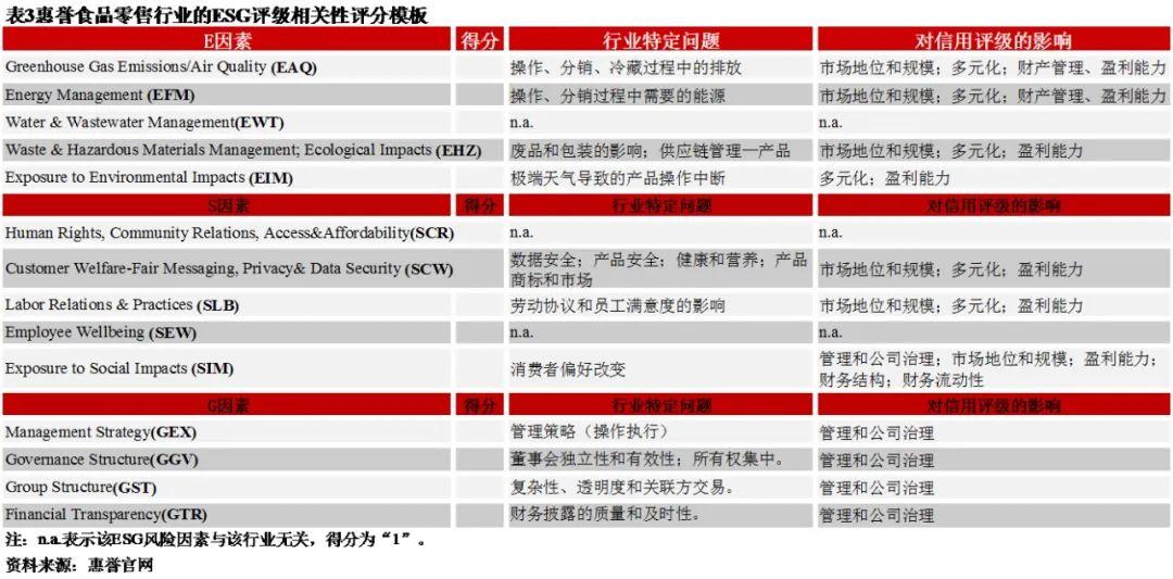 接下来,我们以食品零售行业企业的ESG评级相关性评分为例进行说明。下表列示了惠誉食品零售行业的ESG评级相关性评分模板,“对信用评级的影响”列强调了受影响的具体评级标准因素,在惠誉的信用分析中记录了相应的ESG问题。