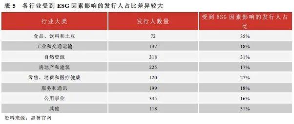 分行业来看,各行业受到ESG因素影响的发行人占比差异较大,分布在16%~35%。其中食品、饮料和土豆大行业受ESG因素影响的发行人占比最大;公用事业大行业受ESG因素影响的发行人占比最小。