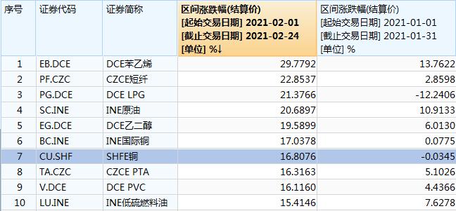 21世纪资本研究院统计数据显示,2月1日至24日,申万基本金属平均涨幅靠前的品种依次为铅锌(17.68%)、铜(16.44%)、铝(15.91%)。