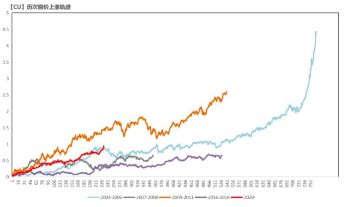 譬如,天风期货就指出,目前铜价的涨幅和速率低于金融危机之后的上涨,与2003年的上涨初期的轨迹基本吻合,明显强于距离最近的2016年的上涨。