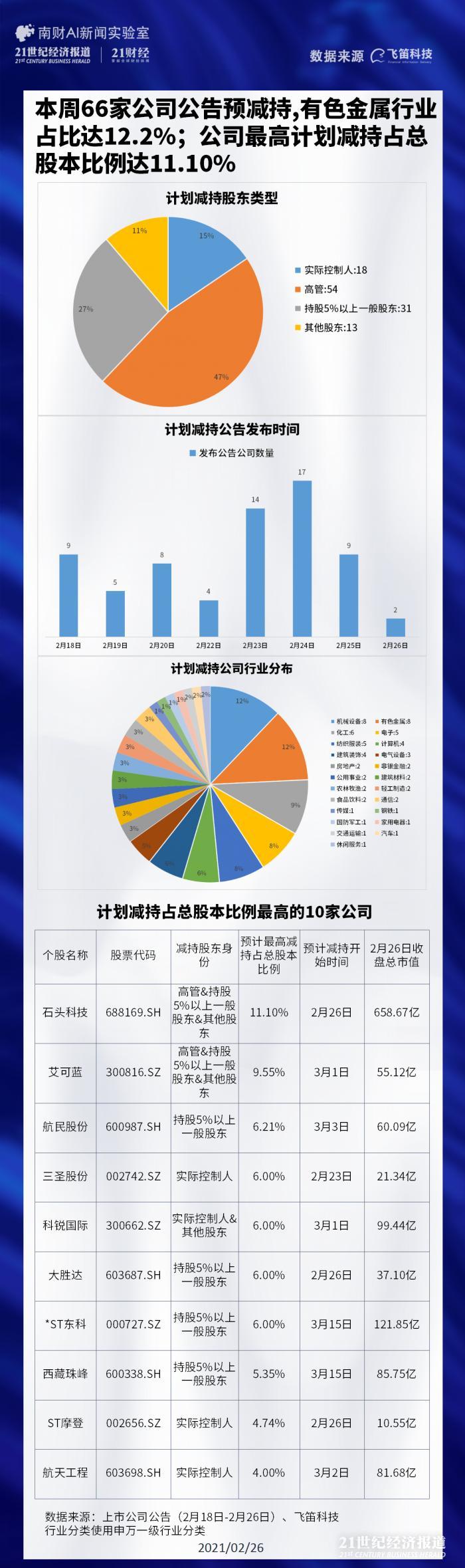 飞笛科技统计了2月18日-2月26日收盘时间区间内发布的上市公司公告中,计划减持比例最高的10家公司,分别为石头科技(688169.SH)、艾可蓝(300816.SZ)、航民股份(600987.SH)、三圣股份(002742.SZ)、科锐国际(300662.SZ)、大胜达(603687.SH)、*ST东科(000727.SZ)、西藏珠峰(600338.SH)、ST摩登(002656.SZ)、航天工程(603698.SH)。
