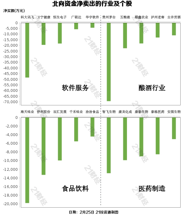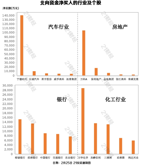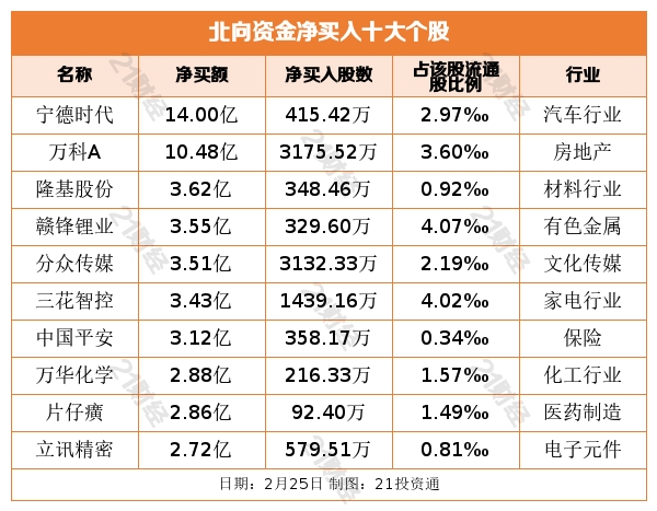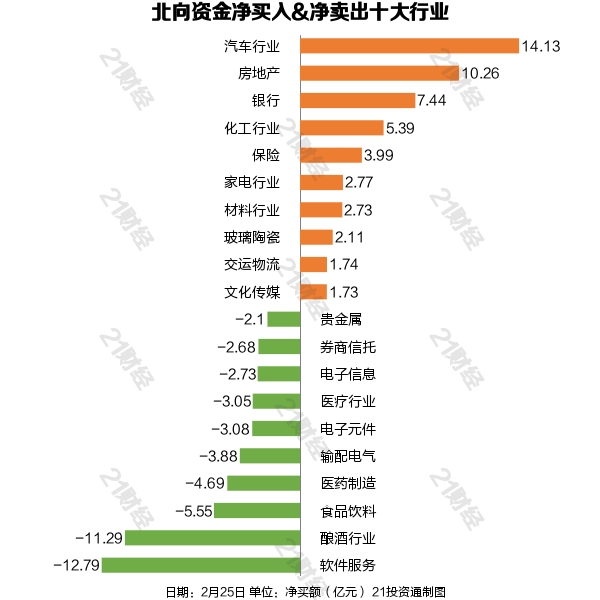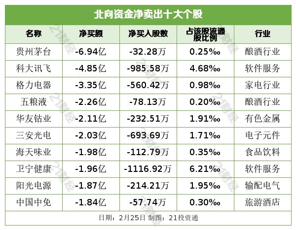 据21投资通(微信号ID:touzit21)智能监测,2月25日,北向资金净卖出7.32亿元,其中沪股通净买入8.41亿元,深股通净卖出15.73亿元。