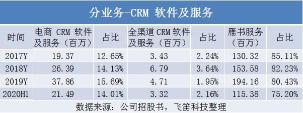 公司CRM软件产品中内嵌了雁书服务;公司客户借助雁书服务进行会员关怀、会员管理、活动通知等,以增加消费者的购物体验和复购率,主要以短信、邮件等触达方式为主。报告期内,公司雁书服务的收入占比最高,2020上半年的收入占主营业务收入的75%,该业务收入呈稳步上升的趋势。公司解释,主要原因是随着公司电商、全渠道CRM软件销售收入的增加,与消费者进行触达的短信、邮件的发送数量也逐年增加。