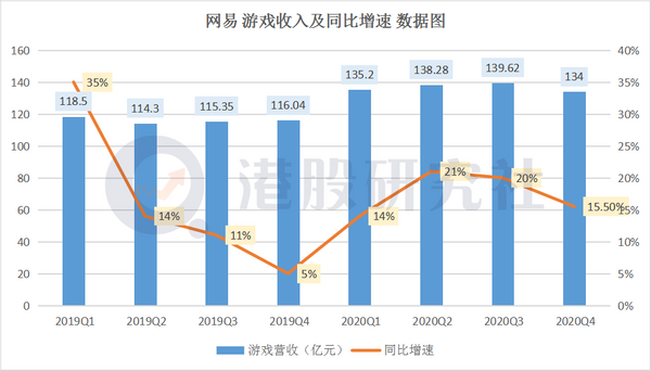 具体来看,2020年四季度,网易在线游戏业务营收为134亿元,同比增长15.5%,更是连续11个季度破百亿,实现稳定增长,主要得益于手游营收的增加以及部分端游的增加。