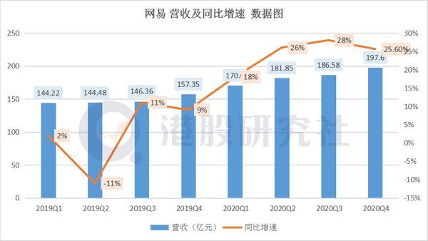 相较于三季度,2020年四季度网易的营收体量进一步扩大。具体来看,网易四季度营收为人民币197.6亿元,同比增长25.6%;相比三季度的186.6亿元增加11亿元,环比增长5.89%;而三季度环比仅增长2.64%。