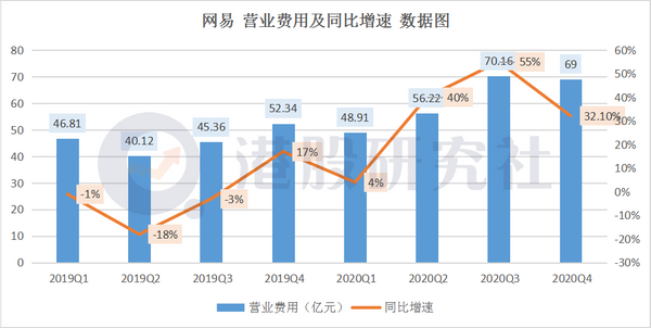 游戏业务净现风光的背后,难免存在一些弊端。而这却恰巧反映在网易四季度出现大幅度增长方面。财报显示,四季度网易运营开支为69.16亿元,而2019年同期为52.34亿元,同比增长32.1%。2020年四季度网易营业费用,同比增加主要是由于在线游戏服务及有道市场推广费增加,以及人员成本和研发投入的增加。