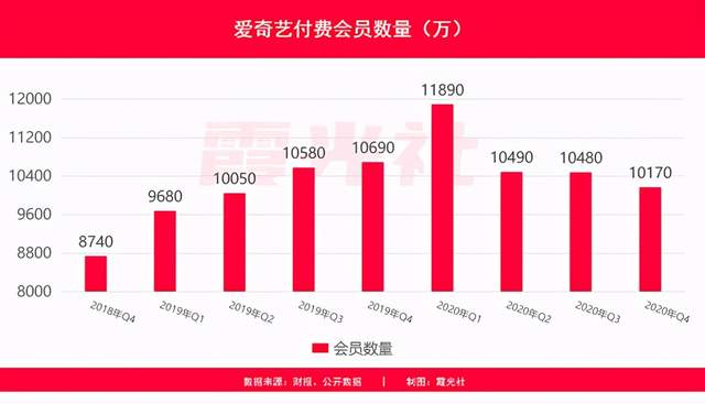 比如,在最新的财报中,一个值得关注点是——自2018年美股上市以来,爱奇艺的年度订阅会员数首次出现同比下滑,从2019年底的1.069亿下降至2020年底的1.017亿。