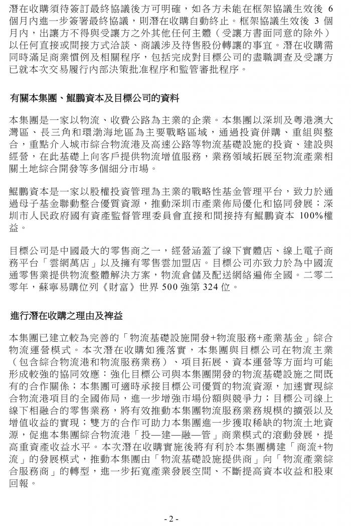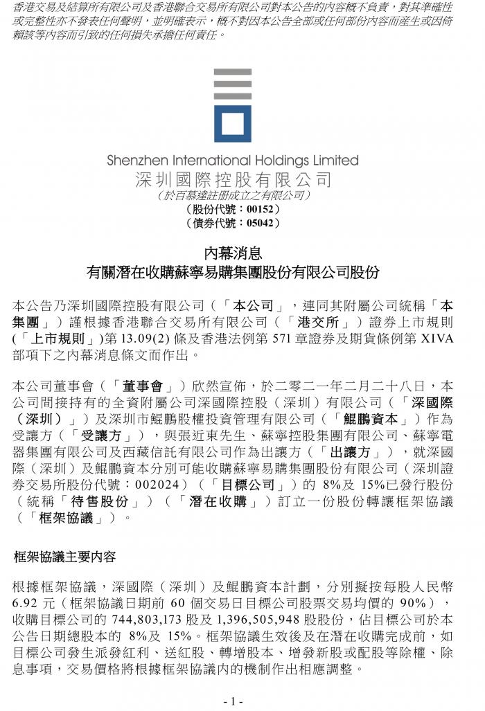 深圳国际2月28日晚间公告称,公司间接持有的全资附属公司深国际控股及深圳市鲲鹏作为受让方。与张近东先生、苏宁控股集团有限公司、苏宁电器集团有限公司及西藏信托有限公司作为出让方。就深国际(深圳)及鲲鹏资本分别可能收购苏宁易购集团股份有限公司的8%及15%已发行股份订立一份股份转让框架协议。根据框架协议,深国际(深圳)及鲲鹏资本计划,分别拟按每股人民币6.92元(框架协议日期前60个交易日目标公司股票交易均价的90%),收购目标公司的7.45亿股及13.97亿股股份,占目标公司于本公告日期总股本的8%及15%。交易分别作价51.54亿元及96.63亿元。