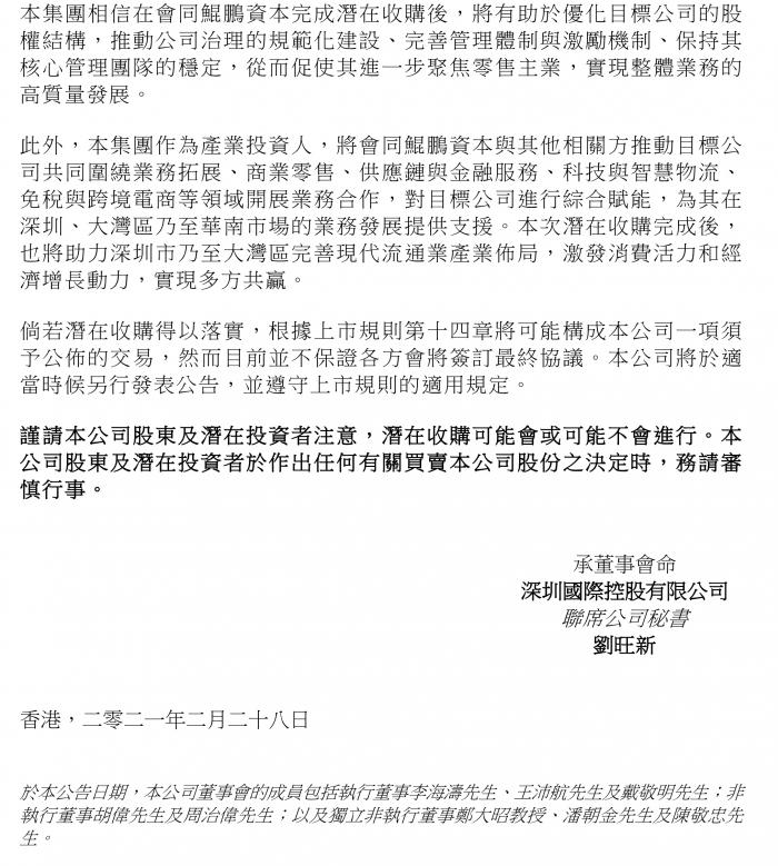 同日晚间,苏宁易购发布公告表示,公司引入深国际、鲲鹏资本战略投资。据公告,公司引进战略股东,将有利于公司进一步聚焦零售服务业务,提高公司资产及业务的运营效率和盈利能力,推动企业长期战略的实施落地。鲲鹏资本持股比例为15%,深国际持股比例为8%,公司控股股东、实际控制人张近东先生及其一致行动人苏宁控股集团、苏宁电器集团持股比例为21.83%。经向深圳证券交易所申请,公司股票将于2021年3月1日(星期一)开市起复牌。