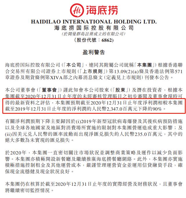 海底捞在港交所公告,预期2020年净利润同比下降约90%。