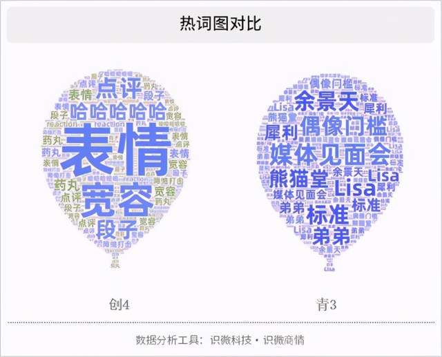 这张来自识微科技的热词对比图可以说明,尽管尝过“淡黄的长裙”屠榜的甜头,《青3》依旧在深耕偶像产业,仍然在探讨偶像的门槛、偶像的标准这些问题。而从《创造101》一路走到《创4》的创系选秀,已经开始从国民偶像的诞生地变成了网络笑料的生产商。这不得不被看成是内娱选秀的一种堕落。