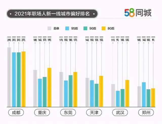 《报告》显示,在2021年职场人愿意换工作的新一线城市中,成都和重庆分别以29%、18%的占比排名第一、二位,可见成渝城市群是职场人心中的就业乐土。