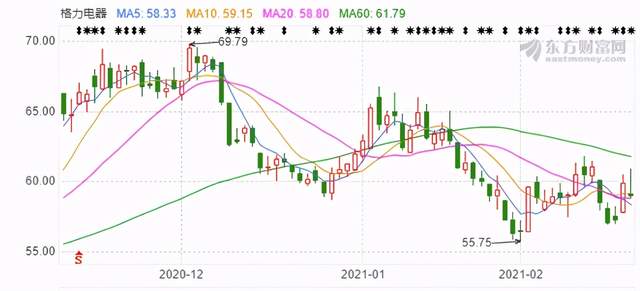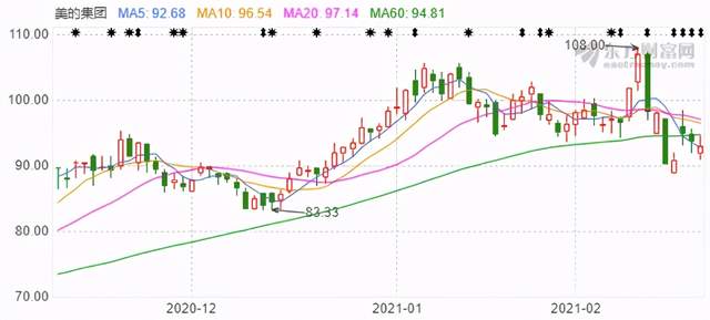 但这一势均力敌的局面在2020年被打破。去年一年,美的股价一路高歌,从50元/股左右涨至近百元,又于节前最后一个交易日创出历史最高108元/股,股价一度比格力高出一倍有余,市值比格力多了近3000亿元。