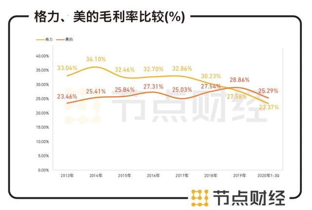2020年前三季度,为了应对市场压力,格力降价促销拉低整体毛利率至23.37%,低于美的的25.29%;净利率为10.96%,和美的10.24%基本持平。