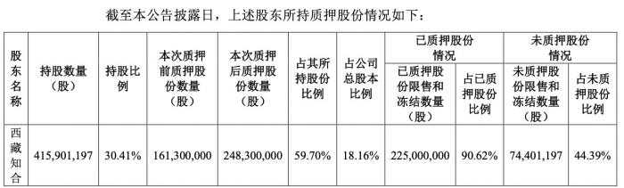 截至1月末的公告披露日,西藏知合合计持有维信诺30.41%股权、共计持415,901,197股。此次质押后,西藏知合公司合计质押上市公司248,300,000股,占其所持有股份比例的59.7%,占维信诺公司总股本的18.16%。