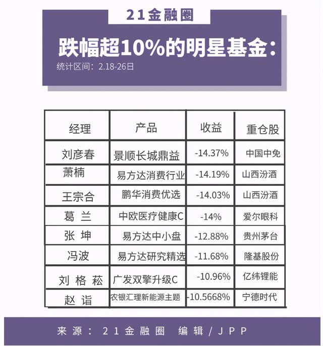 仅2月22日当天,累计跌幅超过5%的基金多达1996只。牛年开始至今,跌幅超10%的明星基金统计如下,张坤等明星经理旗下基金跌幅高达10%以上。