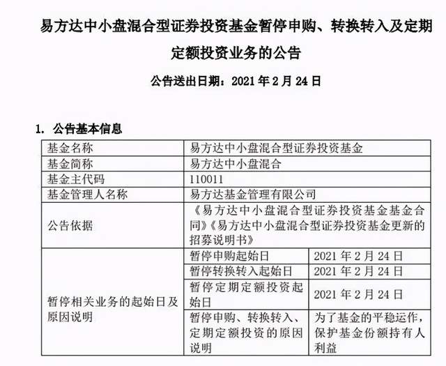 2月23日,易方达中小盘宣布暂停申购,并进行19亿的大额分红。2月24日,易方达价值精选基金也暂停申购了!