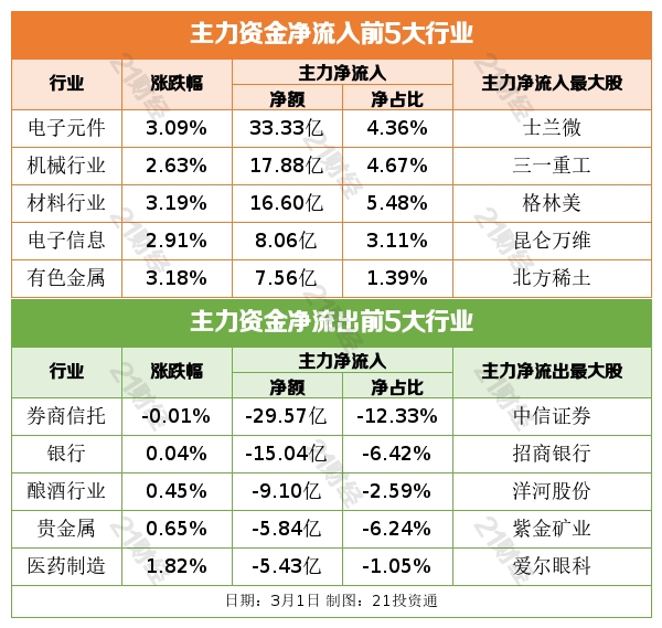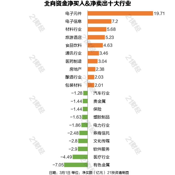 3月1日,北向资金净买入37.86亿元,其中沪股通净买入9.18亿元,深股通净买入28.69亿元。增持电子元件,减持有色金属。