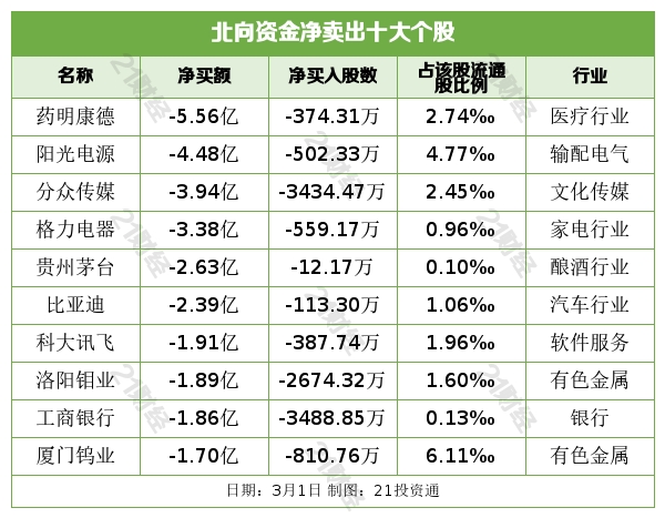 北向资金净卖出药明康德(603259.SH)、阳光电源(300274.SZ)、分众传媒(002027.SZ)、格力电器(000651.SZ)、贵州茅台(600519.SH)居前。