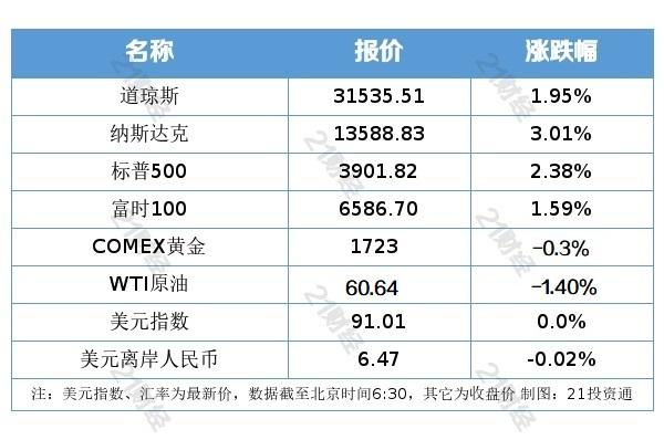 美债收益率下降以及拜登刺激计划获众议院批准,美股在科技股引领下全线飙升,纳指涨近400点涨幅超3%均创11月以来最佳单日涨幅,标普创去年6月5日以来最佳单日表现;科技、区块链及热门中概股表现强势,特斯拉涨近6%,苹果涨超5%,哔哩哔哩涨近15%市值重回500亿美元。