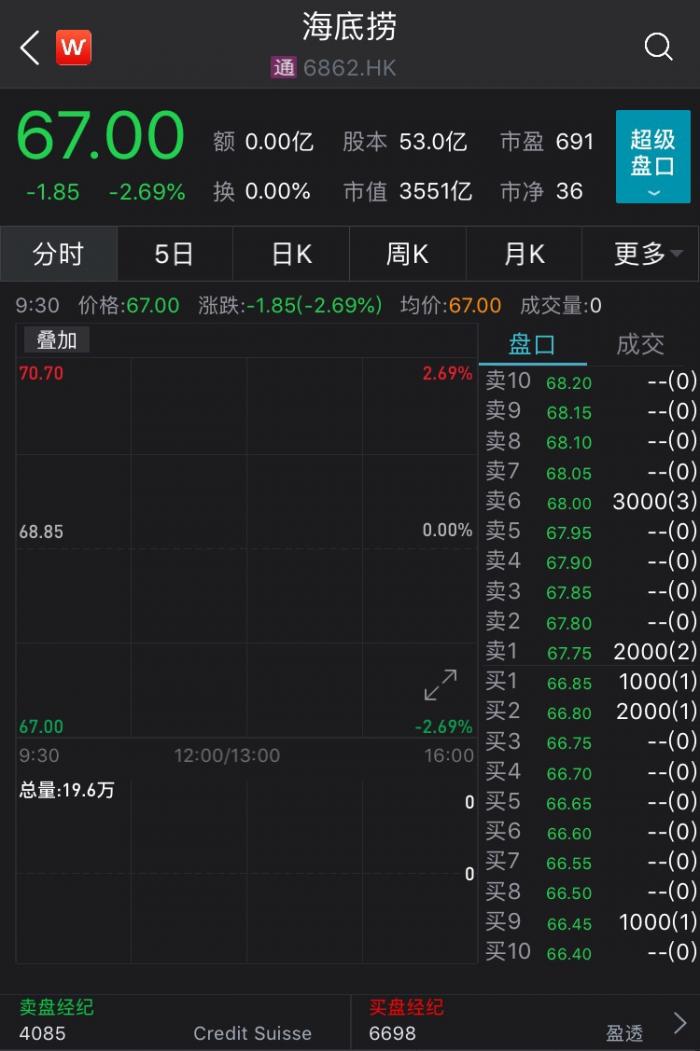3月2日,海底捞(6862.HK)低开2.69%报67港元,盘前成交1313万港元,市值3551亿港元。公司昨晚发盈警,预期2020年净利润相较2019年下降约90%。公司给出的解释是,因新冠疫情防控措施对消费场所实施的限制对本集团营运造成重大影响,此外受到美元兑人民币汇率波动出现汇兑损失2.35亿元。花旗维持海底捞中性评级,目标价55港元,对应20%的下行空间。