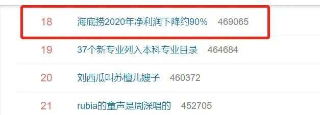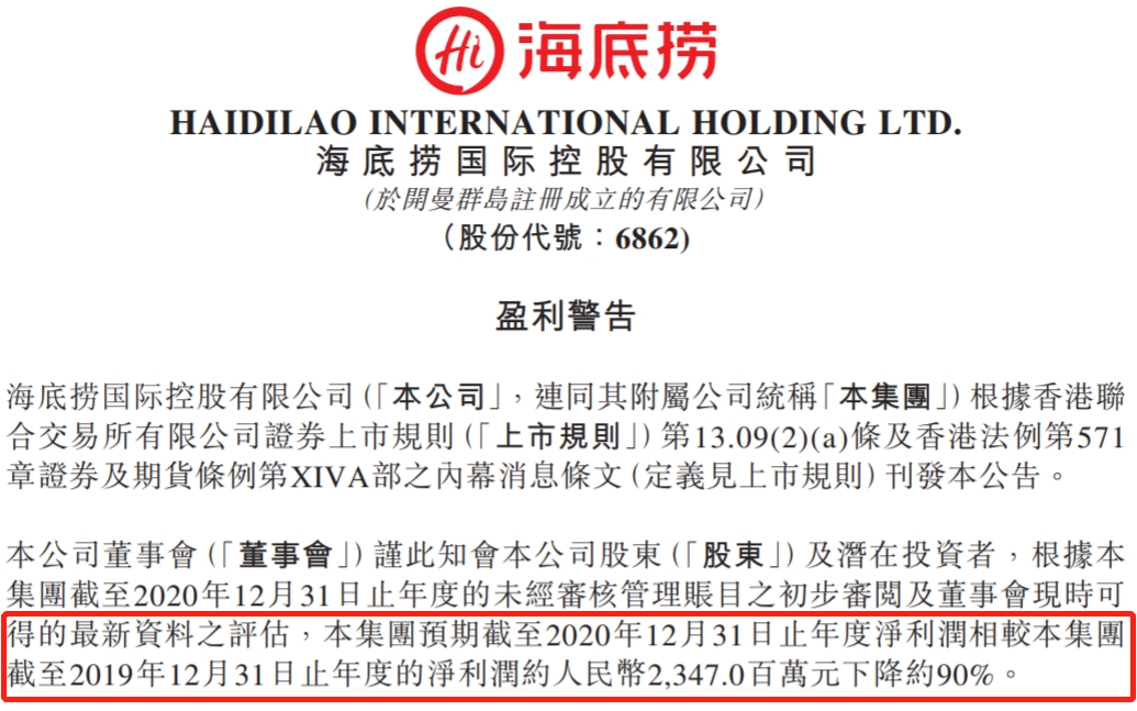 据公告显示,海底捞2019年的净利润为23.47亿元,意味着2020年海底捞的净利润仅有2.35亿元。