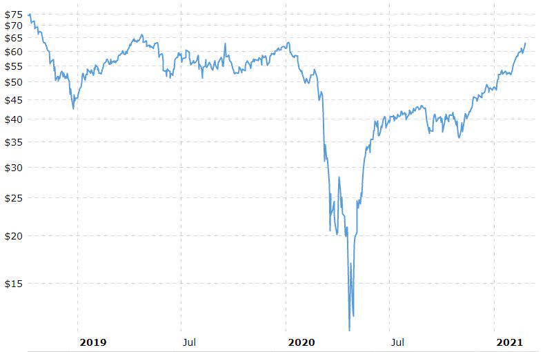 截止2021年2月28日,布伦特原油价格收于64.63美元/桶,WTI原油价格收于61.66美元/桶,这一价格已超过2019年的平均水平。