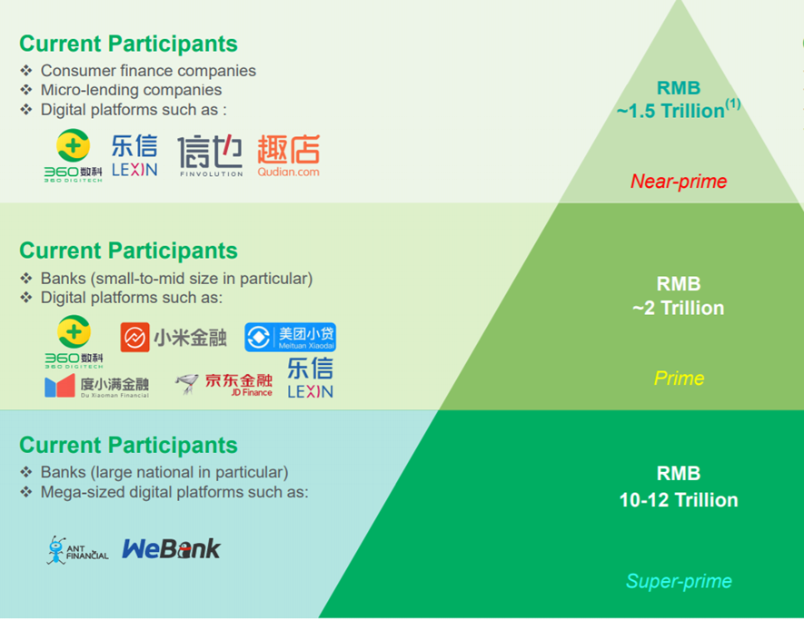 互联网贷款治理导致的直接后果就是,行业加速完成优胜劣汰,资金和客户流量向行业大中型平台聚集。保守估计,行业玩家从早期的上万家减少95%以上,目前互联网贷款机构主要包括四大类:银行(招行、中信、平安旗下陆金所)、互联网巨头(蚂蚁、腾讯、京东、百度、360、美团、滴滴)、产业巨头(小米、国美、苏宁),创业金融科技公司(乐信、信也、趣店)、持牌消费金融(捷信、马上消金、招联等)。