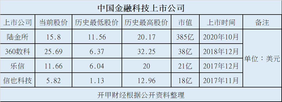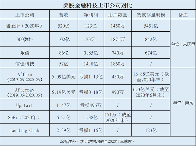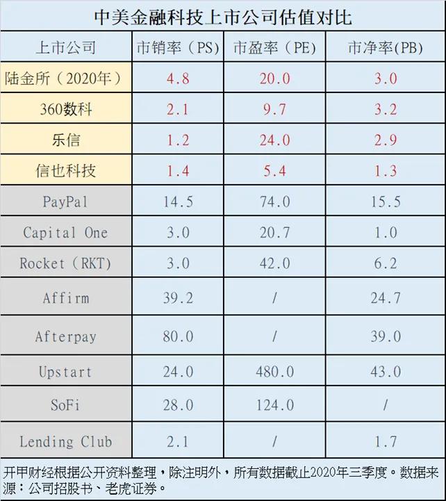 然而,一个奇怪的现象是,上述几家中国金融科技公司在股价大幅反弹之后,其估值仍然远低于美国同类企业。目前,陆金所是海外上市的中国金融科技公司里估值最高的,约385亿美元(约合2500亿元人民币);其次是360数科,38亿美元(约合245亿元人民币);乐信21亿美元,约合136亿元人民币);信也科技18亿美元(约合116亿元人民币)。
