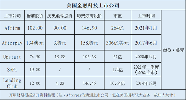 市销率(PS)方面,中国4家金融科技公司里,陆金所最高,4.8倍;360数科2.1倍,乐信和信也科技分别为1.2倍和1.4倍;美股公司中,老牌支付机构PayPal市销率为14.5倍,Capital One和抵押借贷机构Rocket为3倍;其余几家创新公司,Affirm、Afterpay、Upstart以及SoFi最低24倍,最高80倍,平均40倍以上。