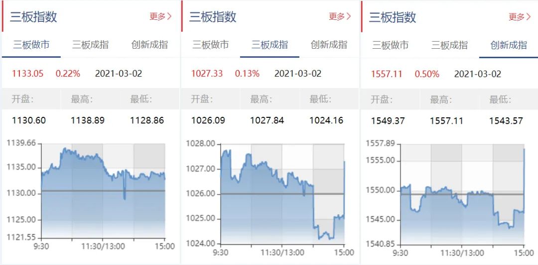 截至3月2日收盘,三板做市报1133.05点,上涨0.22%;三板成指报1027.33点,上涨0.13%;三板创新成指报1557.11点,上涨0.50%。