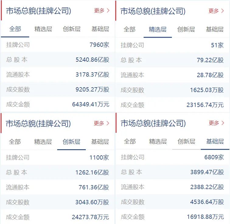 新三板挂牌公司总计7960家(精选层51家,创新层1100家,基础层6809家),总股本5240.86亿股,流通股本3178.37亿股。