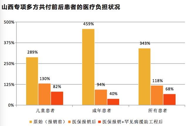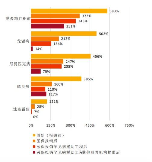 通过医保、罕见病医疗援助工程和其他慈善机构这三方共同分担患者的医疗费后,患者的医疗负担有了大幅度的减轻。如,戈谢病和法布雷病的患者的医疗负担由最初的占家庭收入的502%和122%下降到14%和7%,避免了灾难性医疗支出。