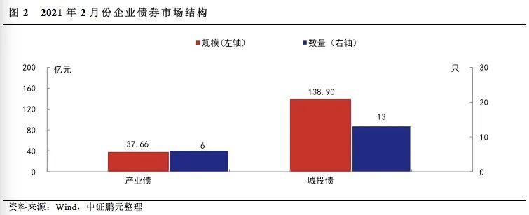 2021年2月,企业债券发行19只,发行规模176.56亿元,与上年同期相比分别上升138%和83%;与2021年1月相比,发行数量和发行规模分别下降30%和37%。从市场结构来看,2月发行的企业债有6只为产业债,发行规模37.66亿元。