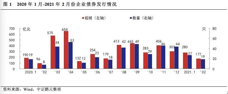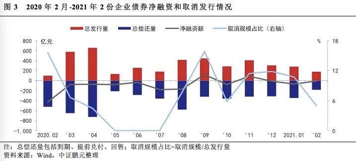 从净融资情况来看,2月企业债券总发行规模176.56亿元,总偿还规模185.30亿元,本月表现为净偿还8.74亿元,上年同期为净偿还428.64亿元。此外,2021年2月有3只企业债券取消发行,原计划发行规模合计8.80亿元。