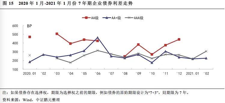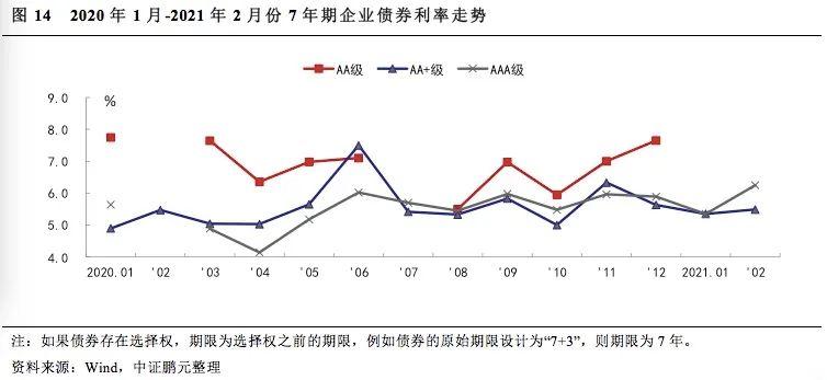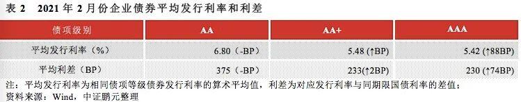 2021年2月,企业债券最高发行利率为7.00%,较上月上行50BP;最低发行利率为4.23%,较上月上行83BP。从债券级别来看,与上月相比,本月AA+级和AAA级企业债平均发行利率上行,利差扩大,其中AAA级变动幅度最大,平均发行利率上行88BP,平均发行利差扩大74BP。