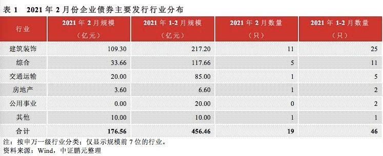 2021年2月,企业债券发行人行业分布于建筑装饰、综合等行业。其中,建筑装饰是当月企业债券的主要行业,共发行109.30亿元,占比61.9%,较上月大幅增长38个百分点;综合类行业发行33.66亿元,占比19.1%,较上月下降10.9个百分点。综合2021年1-2月份看,建筑装饰行业发行规模217.20亿元,占比47.6%,发行数量25只,占比54.3%,是企业债的主要发行行业。
