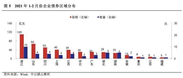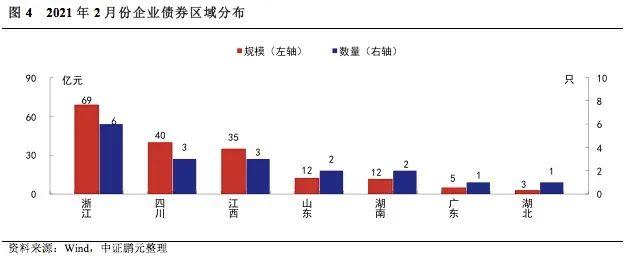 2021年2月,共有7个省份发行了企业债券。其中,浙江省企业债券的发行规模最大,为69亿元;其次是四川省和江西省分别发行40亿元和35亿元,位居第二、三位;其他省份发行规模在15亿元以下。从发行数量上看,浙江省发行6只,四川省和江西省各发行3只,其他城市发行数量在3只以下。与上年同期相比,2月湖北省发行规模较上年同期下降90%,浙江、四川等6个省份上年未发行,本期发行规模较大。