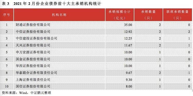 就承销机构而言,2021年2月共有20机构参与企业债券的承销工作。财通证券承销35亿元,位居第一;中信证券以承销12.92亿元位居第二,中信建投证券承销12.25亿元,位居第三。前五大承销商,承销规模合计占比46.5%,较上月下降6.7个百分点。