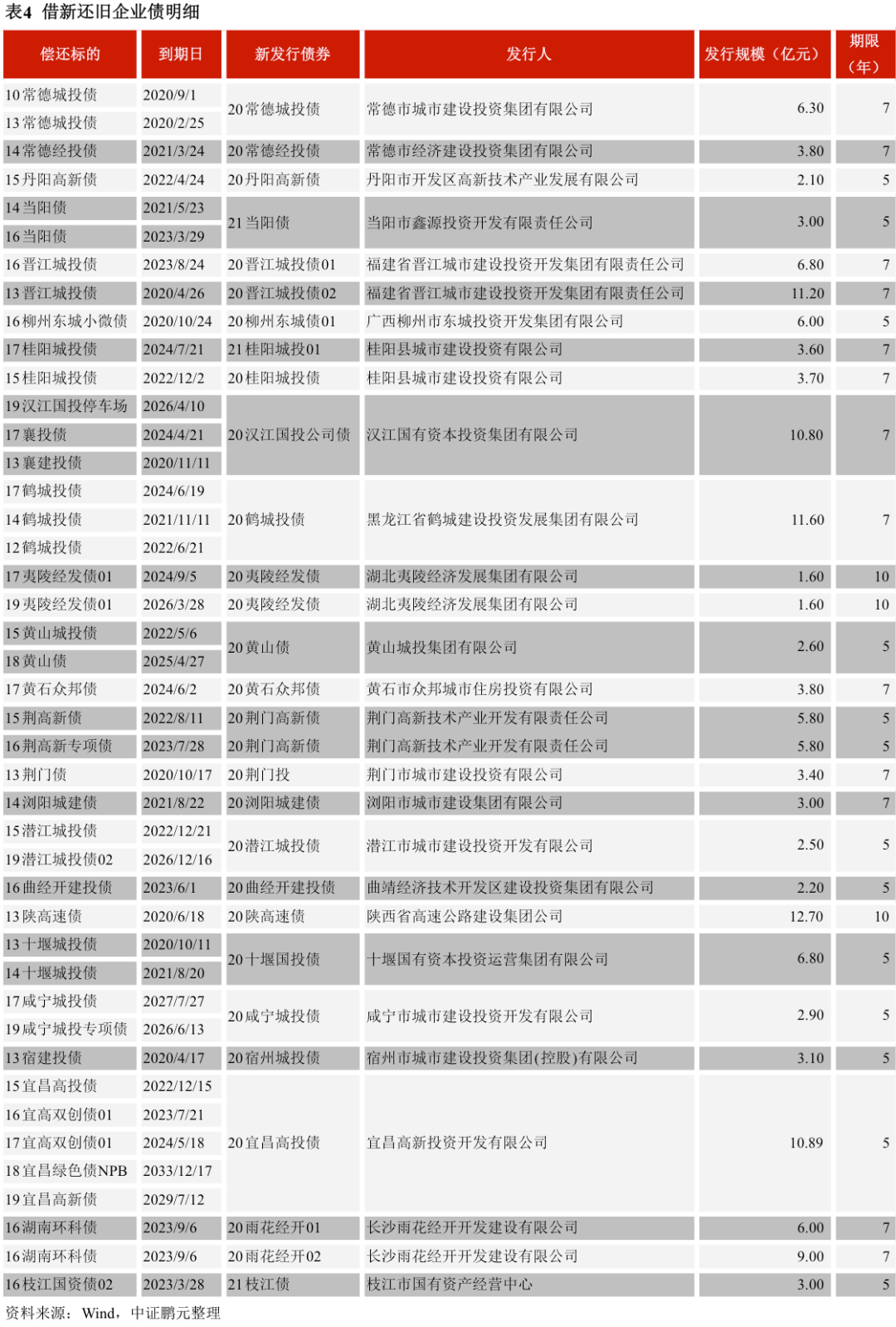 借新还旧企业债的募集资金用于偿还2020年待偿还债券的本息,或置换前期已偿付的2020年企业债券本息资金,例如,“20夷陵经发债”。此外,可以偿还多只债券在2020年内的部分或全部本息,例如,“20汉江国投公司债”。