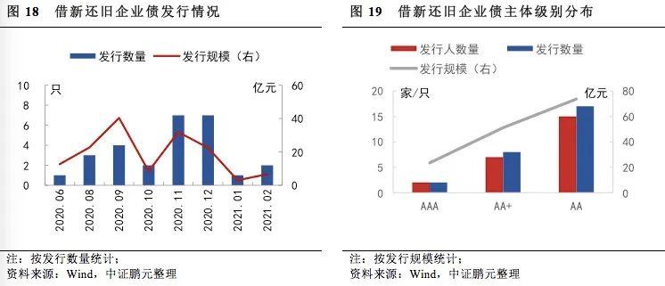 2020年受疫情影响,企业偿债压力攀升,为缓解短期资金压力,2月发改委发布《关于疫情防控期间做好企业债券工作的通知》(发改办财金〔2020〕111号),明确“对于自身资产质量优良、募投项目运营良好,但受疫情影响严重的企业,允许申请发行新的企业债券专项用于偿还2020年内即将到期的企业债券本金及利息。”从实际发行看,2020年借新还旧企业债从6月开始发行,发行数量在11月、12月达到峰值,2021年前2个月共发行3只。截至2021年2月,共发行借新还旧企业债27只,发行规模148.19亿元。从级别分布看,主要是AA级主体,占比62.5%。从公司属性看,均为城投公司。