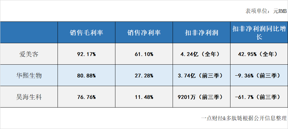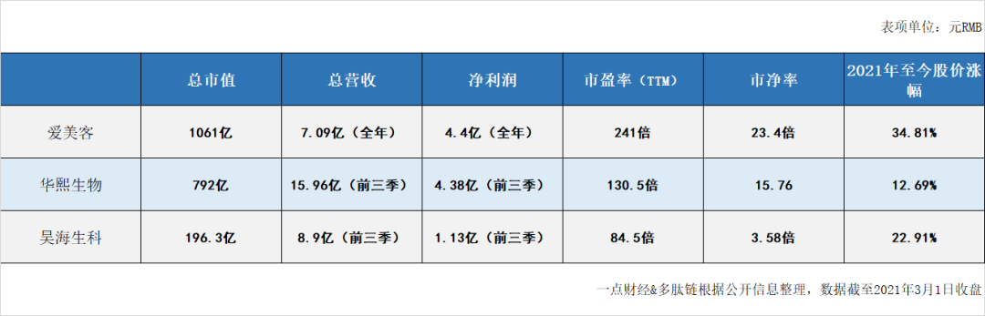 比较营业总收入,爱美客是三家公司中最低的;比较净利润,华熙生物前三季度就已接近爱美客全年净利润水平,但爱美客的总市值却是另两家同业之和。