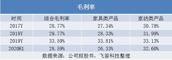 公司毛利率表现如何?报告期内,公司的综合毛利率分别为28.77%、29.77%、33.59%和28.59%,2017年至2019年,公司的毛利率呈逐年上升趋势,主要受家具类产品和家纺类产品毛利率均有所提升所拉动。公司产品毛利率的提升,公司解释为推出的新产品毛利率较高、公司议价能力增强使得采购成本降低以及毛利率较高的B2C模式销售占比逐年提升综合所致。